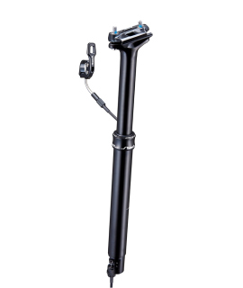 MTB adustable seatpost diameter 31.6 x 410mm with internal cable. Seat post with height-adjustable seat post and handlebar lever. Manufactured from 6061-T6 aluminum. Black anodized. Mixed oil-air internal mechanism. Excursion 120mm load 100kg
